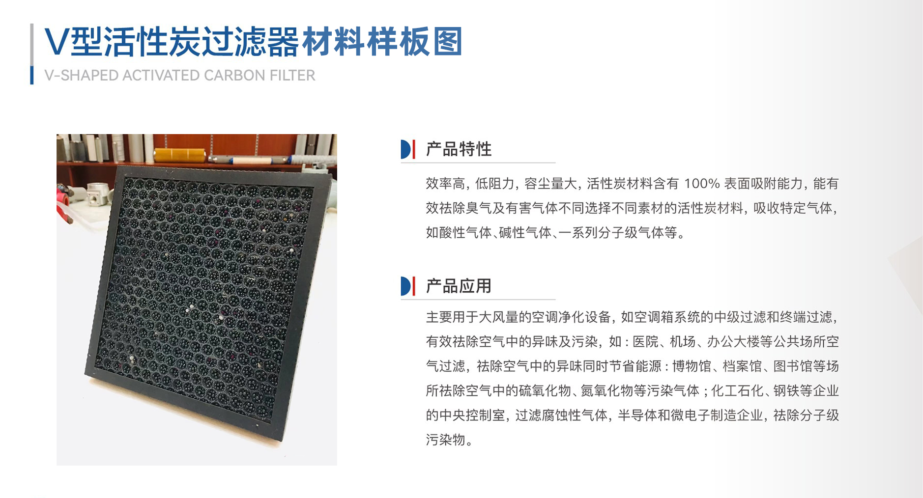 主要用于大風量的空調凈化設備,如空調箱系統的中級過濾和過濾祛除空氣中的異味及污染,如:醫院、機場、辦公大樓等公共場所空氣過濾,祛除空氣中的異味同時節省能源:博物館、檔案館、圖書館等場所祛除空氣中的硫氧化物、氮氧化物等污染氣體;化工石化、鋼鐵等企業的中央控制室,過濾腐蝕性氣體,半導體和微電子制造企業,祛除分子級污染物。