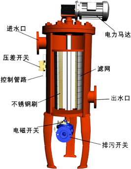 采用機(jī)電一體化設(shè)計(jì)。全自動(dòng)自清洗過濾器由驅(qū)動(dòng)機(jī)構(gòu)、控制管路(包括壓差開關(guān))、主管組件、濾芯組件、清洗機(jī)構(gòu)、連接法蘭等主要零部件組成。 電控器、控制管路和排污閥構(gòu)成過濾器的控制部分,用于實(shí)現(xiàn)自動(dòng)清洗排污過程。 控制管路由壓差開關(guān)、管接頭、黃銅管等附件組成。過濾器常規(guī)產(chǎn)品使用不銹鋼轉(zhuǎn)刷,也可根據(jù)不同的使用條件(水溫、水質(zhì)),選用其它材質(zhì)的轉(zhuǎn)刷。